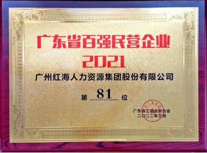近日,廣東省工商聯(lián)(總商會)在廣州召開十二屆七次執(zhí)委會議。會上正式發(fā)布“2021年廣東省百強(qiáng)民營企業(yè)”榜單,紅海人力集團(tuán)位列第81名,連續(xù)三年榮登“廣東省百強(qiáng)民營企業(yè)”榜單。