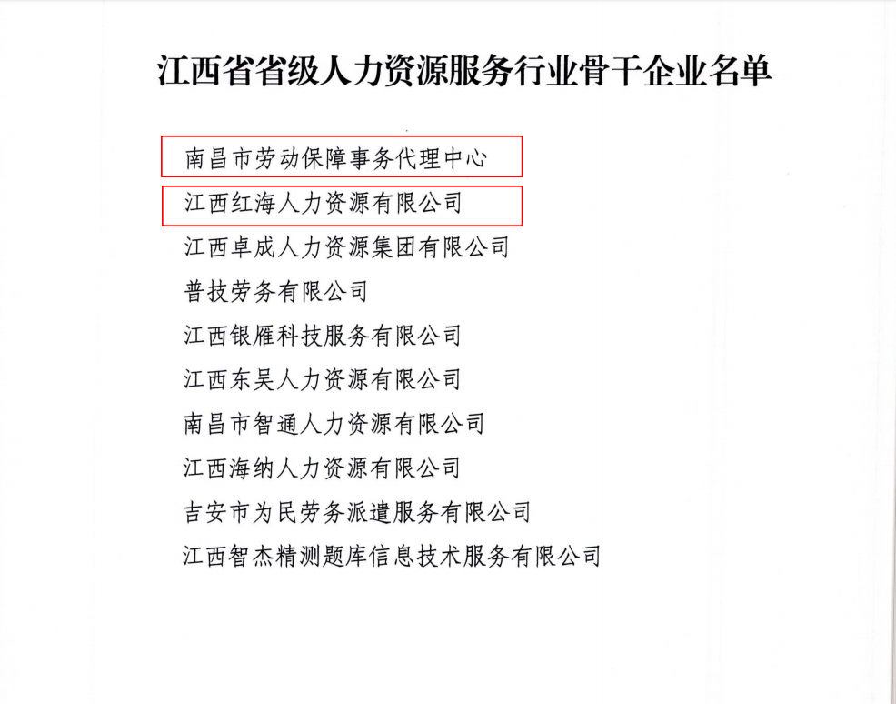 近日,江西省人力資源和社會保障廳公布《江西省人力資源和社會保障廳關(guān)于認(rèn)定江西省省級人力資源服務(wù)行業(yè)領(lǐng)軍企業(yè)、骨干企業(yè)和領(lǐng)軍人才的通知》。認(rèn)定江西紅海人力資源有限公司為“江西省省級人力資源服務(wù)行業(yè)骨干企業(yè)”。