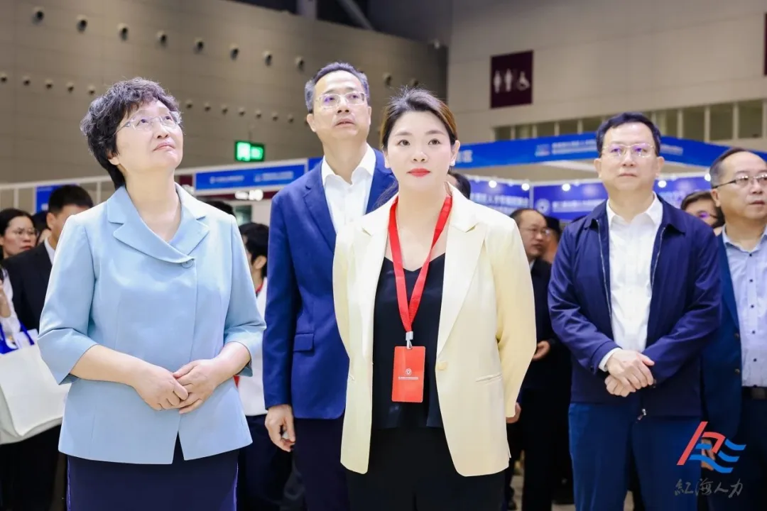 大會(huì)開(kāi)幕式后,人力資源和社會(huì)保障部黨組書(shū)記、部長(zhǎng)王曉萍蒞臨紅海人力集團(tuán)展臺(tái)視察指導(dǎo)。