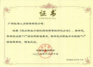 2007年申請(qǐng)廣州市民辦職業(yè)介紹信用等級(jí)評(píng)定工作,從148家企業(yè)中脫穎而出,被評(píng)為"A"級(jí)信用單位,并被市推薦為“AA”級(jí)單位。
