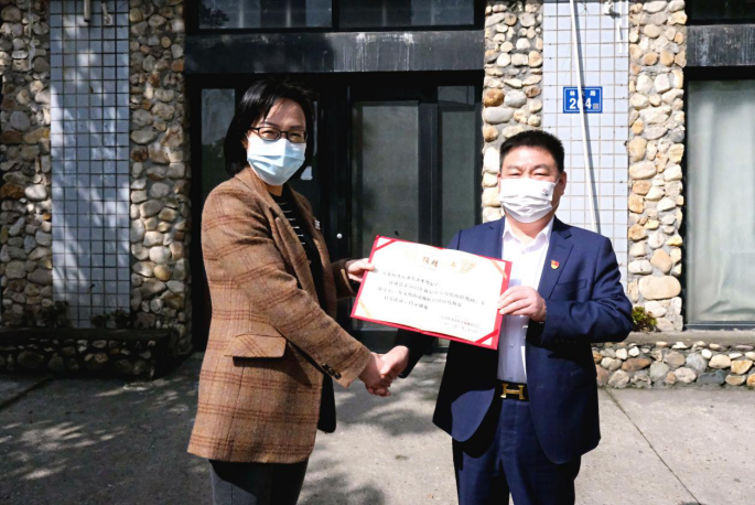 區(qū)政協(xié)副主席、工商聯(lián)主席王珊為湖南紅海人力頒發(fā)捐贈(zèng)證書