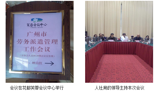 12月18至19日,2014年廣州市勞務派遣管理工作會議在花都區(qū)芙蓉會議中心舉行。出席本次會議的有:市人社局陳建龍副局長、人社局勞動關系處吳林濤處長、楊秋元副處長、市勞監(jiān)支隊彭敘榮隊長、各區(qū)縣人社局的相關負責人及本市獲得許可或備案的30家勞務派遣企業(yè),紅?;ǘ挤止緦幇⒚房偨?jīng)理與助理經(jīng)理林川參加了本次會議。