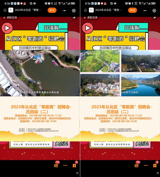 線下招聘會結(jié)合就業(yè)驛站網(wǎng)絡(luò)招聘專區(qū)同步在線上進(jìn)行直播帶崗,直播間開播首先宣傳推廣了呂田鎮(zhèn)的特色文化宣傳片,并邀請企業(yè)代表進(jìn)入直播間介紹企業(yè)和崗位信息,與線上求職者互動,直播間觀看量達(dá)上千人次,滿足求職者“足”不出戶,也能“碼”上就業(yè),同時也通過直播間很好的宣傳了呂田鎮(zhèn)的風(fēng)貌、景觀,從而帶動更多的人們能夠來到從化區(qū)呂田鎮(zhèn)的旅游風(fēng)景區(qū)進(jìn)行游玩觀賞。