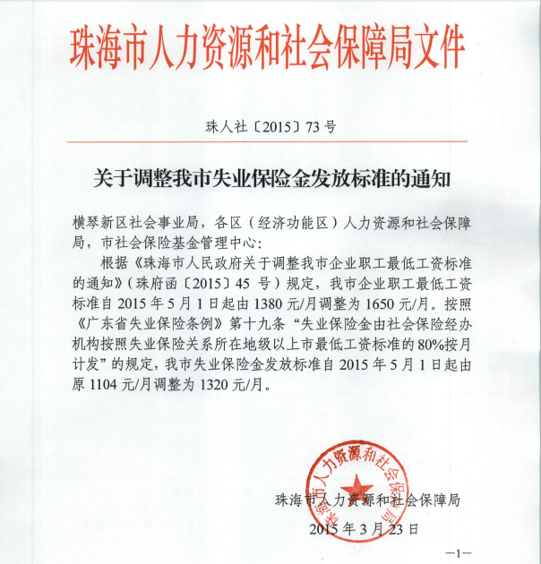 關(guān)于調(diào)整珠海市失業(yè)保險金發(fā)放標(biāo)準(zhǔn)的通知