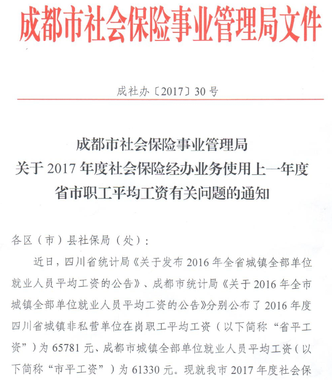 成社辦〔2017〕30 號關(guān)于2017年度社會保障經(jīng)辦業(yè)務(wù)使用上一年度省市職工平均公司有關(guān)問題的通知