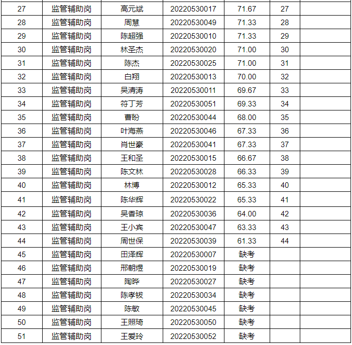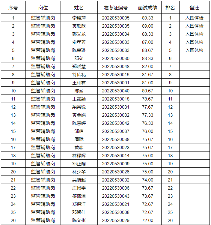 因工作需要,我司受??诿捞m機(jī)場海關(guān)委托向社會公開招聘美蘭機(jī)場海關(guān)協(xié)管員衛(wèi)生檢疫輔助崗1名、計算機(jī)管理輔助崗1名,監(jiān)管輔助崗3名,我司于2022年5月30日對符合條件的報考人員開展招聘面試考試,因無人參加衛(wèi)生檢疫輔助崗和計算機(jī)管理輔助崗的面試,現(xiàn)取消上述兩個崗位的招聘,調(diào)整招聘監(jiān)管輔助崗5名,現(xiàn)按照報考崗位發(fā)布有效面試成績公示,公示時間為5月31日至6月2日,監(jiān)督電話:0898-68532611。